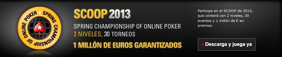 PokerStars nos tiene preparados otra de sus grandes series de torneos en el inicio de esta primavera. Se trata del SCOOP 2013 (Spring Championship Of Online Poker). Esta vez cada torneo tendrá una versión de entrada más económica y otra de buy-in más elevado. Esta serie de torneos discurrirá del 1 al 12 de mayo y podemos tratar de clasificarnos mediante satélites desde ahora mismo.